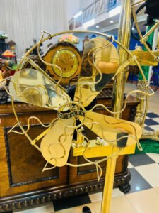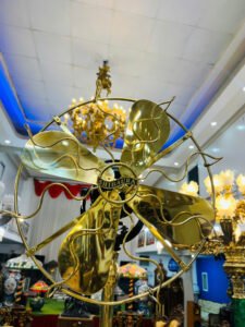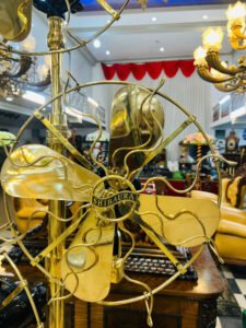 ✨ Toàn thân quạt sử dụng đồng sáng bóng, kết hợp chân đế gang đúc nguyên khối chắc nịch, vận hành ổn định. Lồng quạt uốn nghệ thuật, cánh kim loại tạo hình mềm mại nhưng đầy sức mạnh – đúng tinh thần công nghiệp Nhật Bản đầu thế kỷ XX.