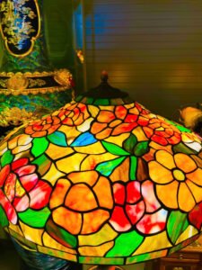 Chụp đèn: ghép kính màu Tiffany thủ công, mỗi mảnh kính mang sắc độ riêng, tạo nên bức tranh ánh sáng rực rỡ khi thắp sáng.