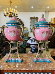 - Đôi bình sứ cao cấp mang phong cách Rococo châu Âu, với gam hồng ngọc sang trọng và họa tiết hoa – bướm vàng vẽ tay tinh xảo.