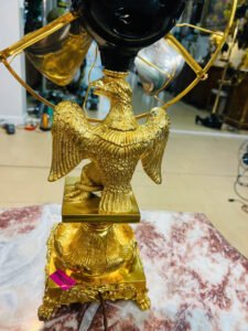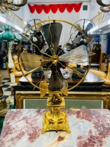 Tác phẩm quạt tượng Marelli trứ danh, mang dáng hình đại bàng tung cánh – biểu trưng cho quyền uy, sức mạnh và sự thịnh vượng. Toàn bộ phần chân đế và tượng đại bàng đúc đồng, mạ vàng sang trọng, chạm khắc tinh xảo từng chi tiết từ móng vuốt, lông cánh đến thần thái oai vệ