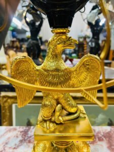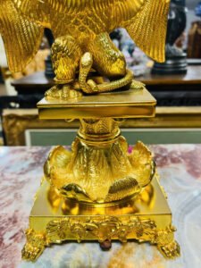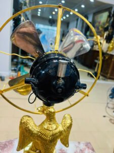 Tác phẩm quạt tượng Marelli trứ danh, mang dáng hình đại bàng tung cánh – biểu trưng cho quyền uy, sức mạnh và sự thịnh vượng. Toàn bộ phần chân đế và tượng đại bàng đúc đồng, mạ vàng sang trọng, chạm khắc tinh xảo từng chi tiết từ móng vuốt, lông cánh đến thần thái oai vệ